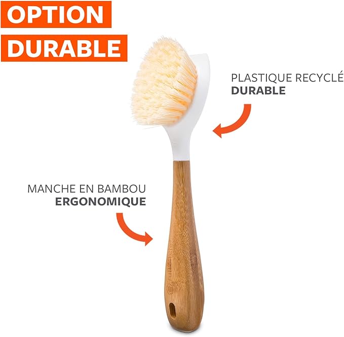 La brosse à vaisselle Full Circle est écoresponsable, alliant design naturel et performance durable. En effet, fabriquée avec un manche en bambou durable et des poils en plastique recyclé, c'est une solution idéale pour préserver la planète. Sa tête équipée d’un grattoir intégré élimine les résidus incrustés sans rayer, tandis que ses poils résistants nettoient en profondeur tout en restant sûrs pour les revêtements antiadhésifs.